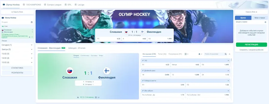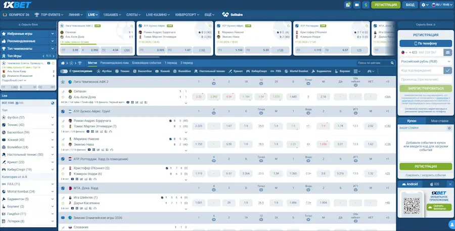Чуть ниже располагается меню с основными разделами платформы. Линия — это прематч-ставки на события, которые ещё не начались. Доступны все виды спорта с детализацией по турнирам, включая топовые соревнования вроде Лиги Чемпионов. Лайв предлагает ставки в режиме реального времени по ходу матча. Количество доступных исходов зависит от популярности турнира — для топовых встреч их может быть несколько десятков.